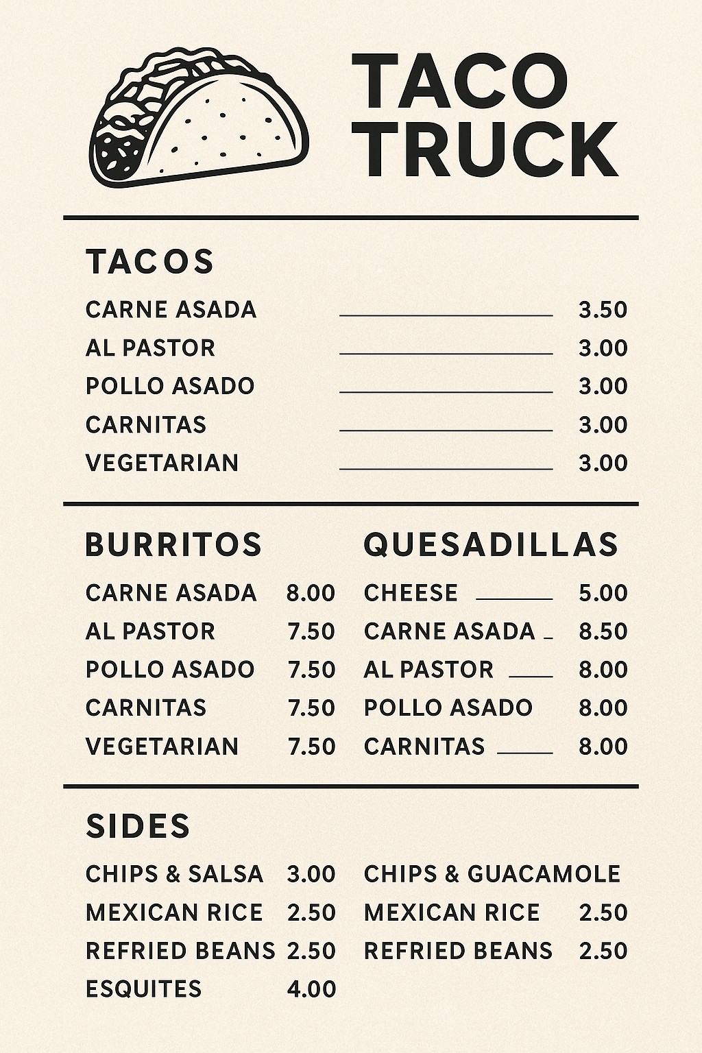 Our taco truck menu is packed with bold, authentic flavors that cater to every craving — from classic street-style tacos like Carne Asada and Al Pastor to hearty burritos, gooey quesadillas, and satisfying sides like Mexican rice, refried beans, and esquites. Whether you're grabbing a quick bite or building a full plate, our offerings are made fresh with quality ingredients and simple, crave-worthy combinations. There’s something for everyone, including vegetarian options and fan-favorite chips with guacamole. Every item is crafted to bring the vibrant taste of traditional Mexican street food right to your hands.